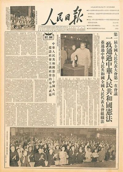 1954年9月21日《人民日报》头版报道了“五四宪法”通过的消息。图源:人民日报图文数据库