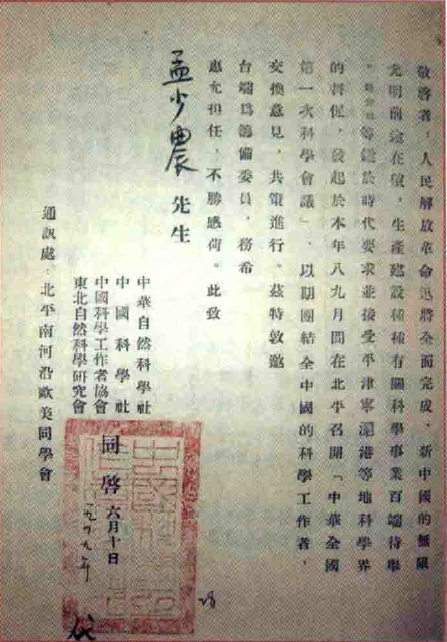 1949年,为团结和发动全国科学工作者从事新中国建设,中华自然科学社、中国科学社、中国科学工作者协会和东北自然科学研究会联合发起召开中华全国自然科学工作者代表会议,图为给专家的邀请函。图源:中国科协会史陈列馆