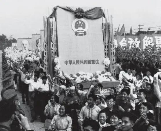 1954年国庆节,游行群众抬着《中华人民共和国宪法》模型通过天安门。图源:澎湃新闻