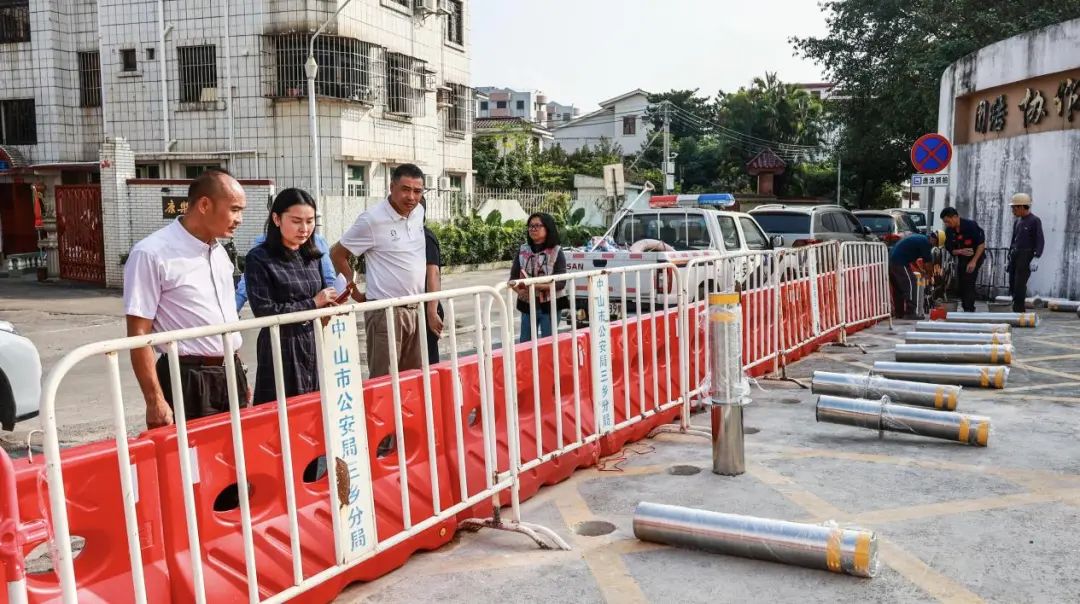 在三乡镇体育运动中心,郭明星一行检查体育中心门前硬隔离措施安装情况,郭明星指出,为了妥善防范和应对反恐防暴等突发事件,必须制定详尽的安全预案,并定期组织应急演练活动,进一步增强各级工作人员处置突发事件的能力和自我保护意识。