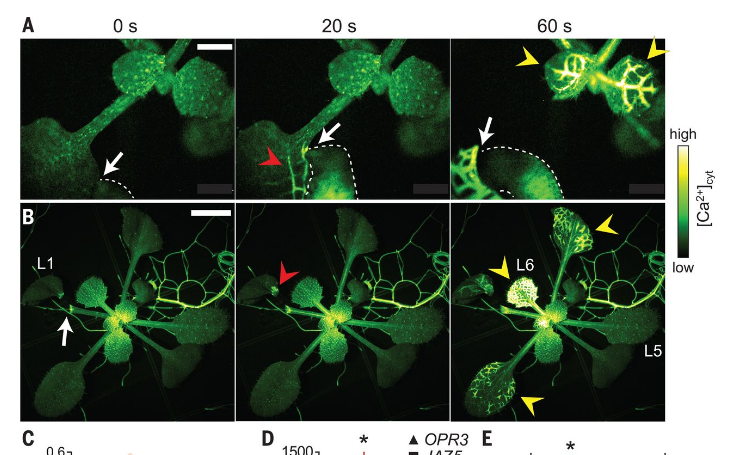 拟南芥对伤害的反应,白色箭头处为受伤处,闪光则表示钙信号的传递