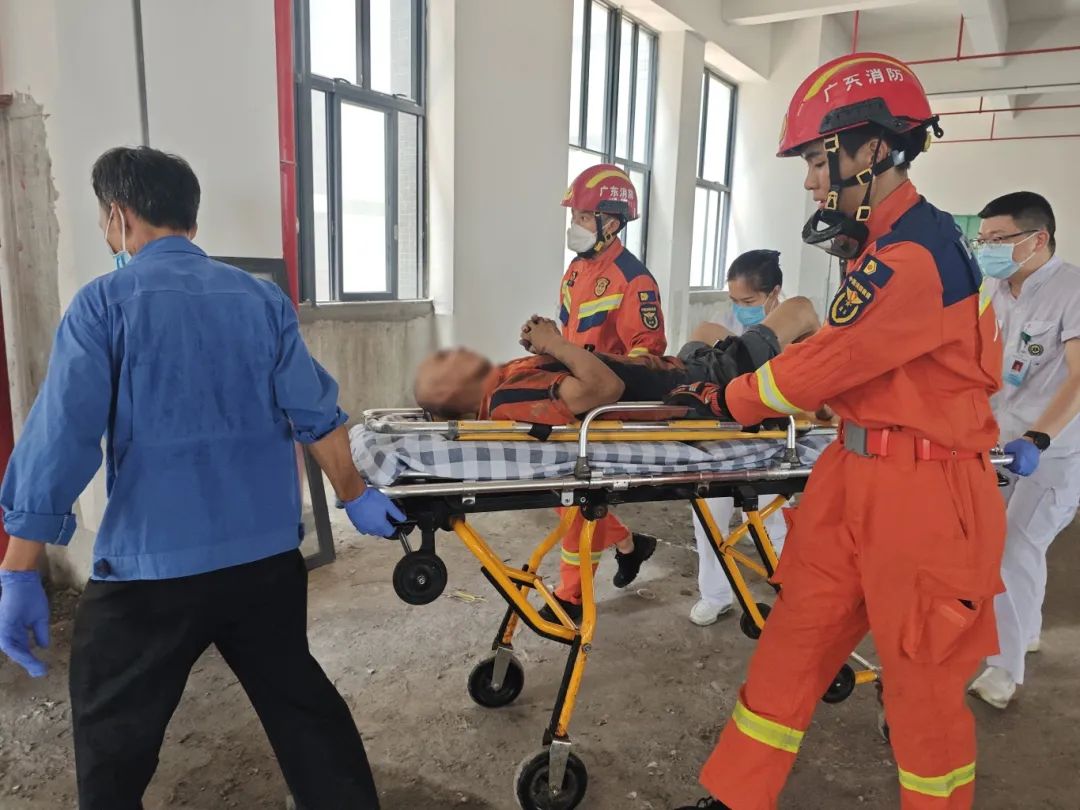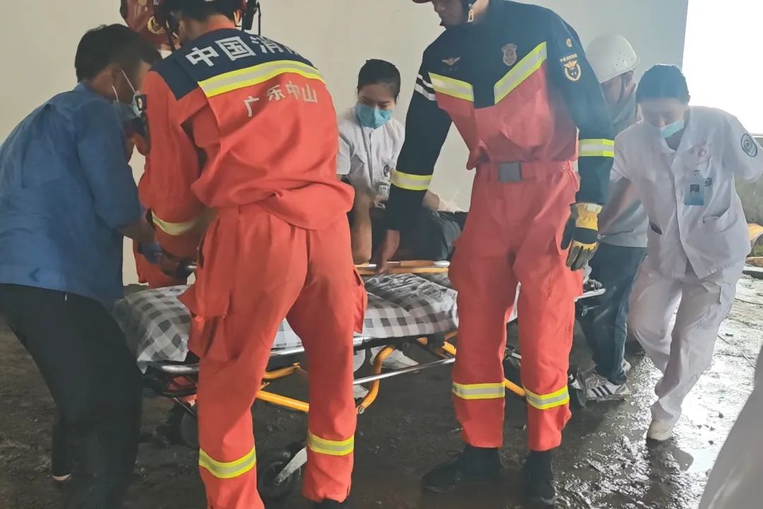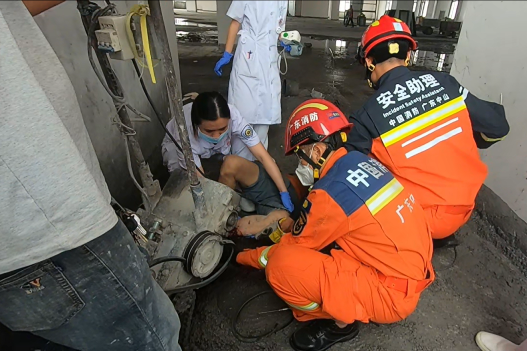 6月28日中午,大涌镇南文社区某工业园区内一名工人左脚被卡在刨地机内动弹不得,情况紧急。
