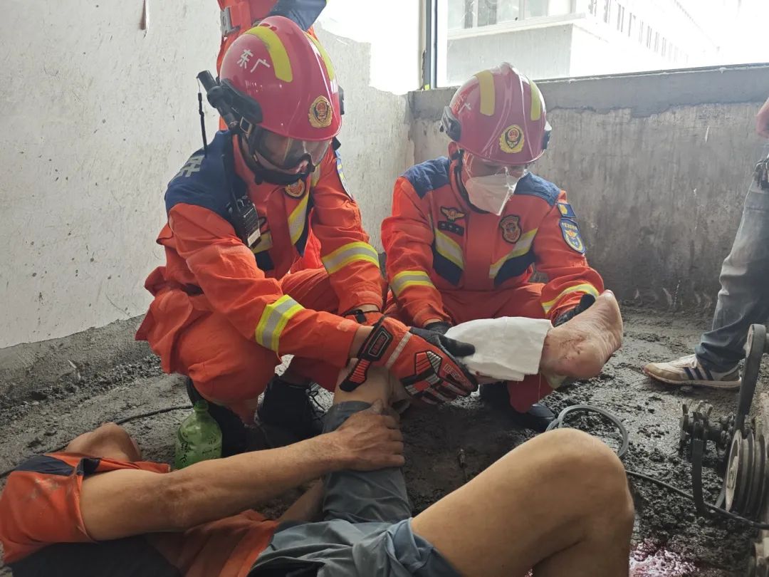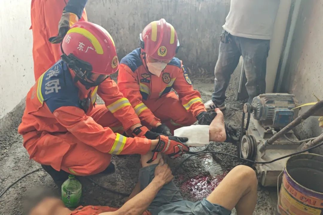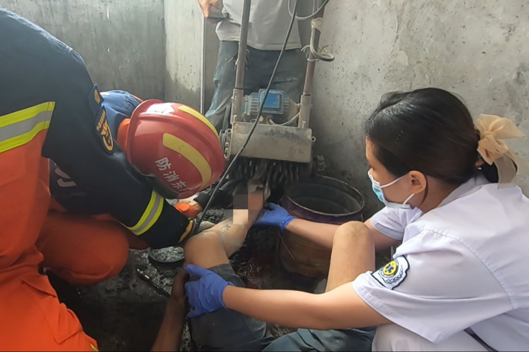 消防员接警后迅速赶往现场,到场后见一名男子躺在地上,左小腿被卡在刨地机内,鲜血直流,一名工友在现场扶住设备,焦急地鼓励着受伤男子。