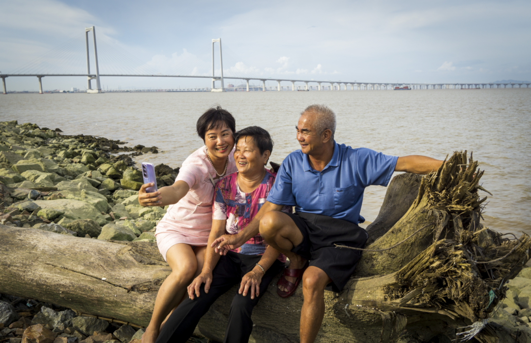 深中通道通车的这一年里,我时常来通道入口附近游览,拍下所见所闻。在海岸边的堤围上,遇到了温馨的一幕:一位女士正陪伴着年迈的父母拍照留影,老人们步子缓慢,却在女儿的搀扶下笑得格外灿烂。海风轻轻吹过,亲情的暖意与城市发展的脉搏在此刻悄然交融。