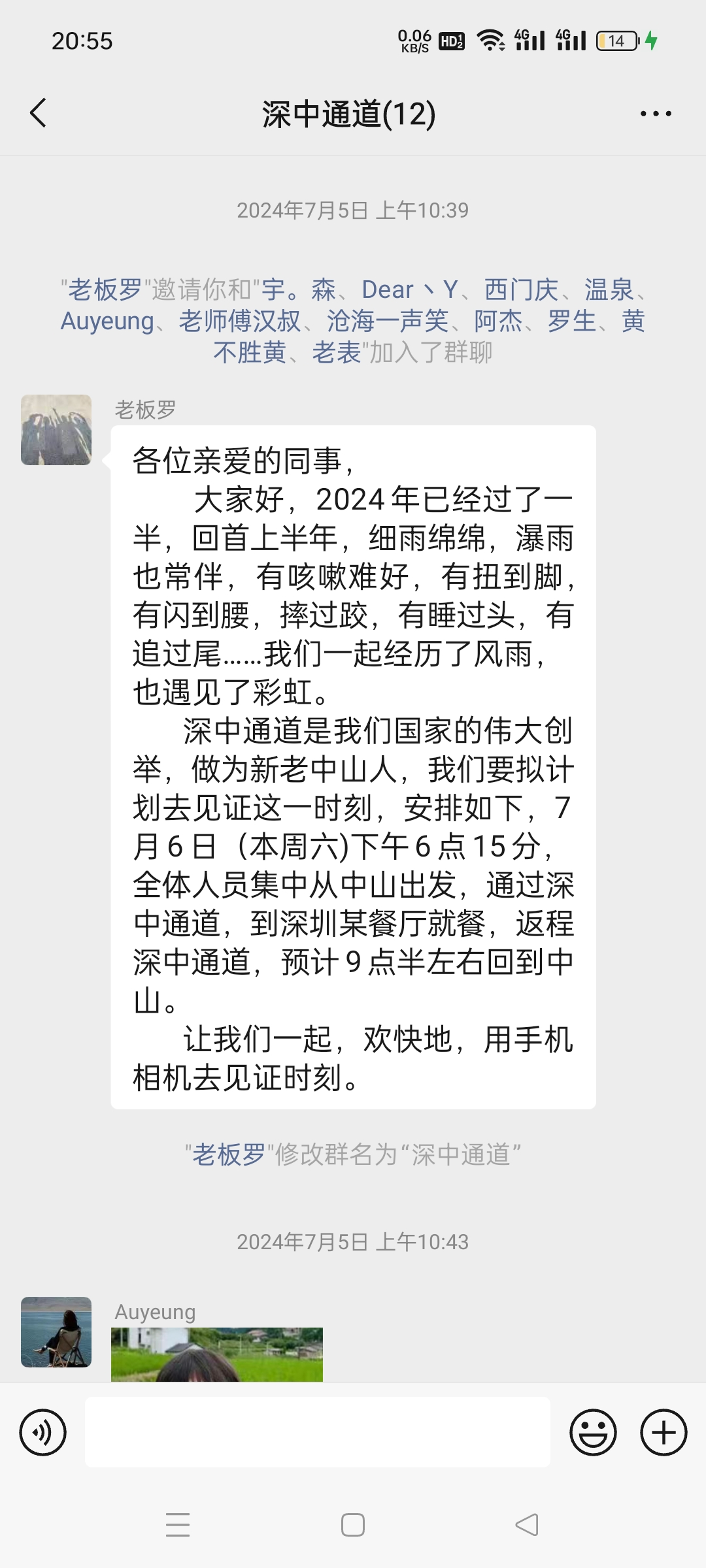 去年7月,为了共同见证深中通道通车这一历史时刻,老板特意组织同事们一起开车走深中通道前往深圳聚餐,然后再原路返回中山。一路上,大家欢声笑语,体验了新开通的磅礴雄伟的跨海通道,也感受了湾区发展的蓬勃气象!这张聊天截图,我一直保存至今!