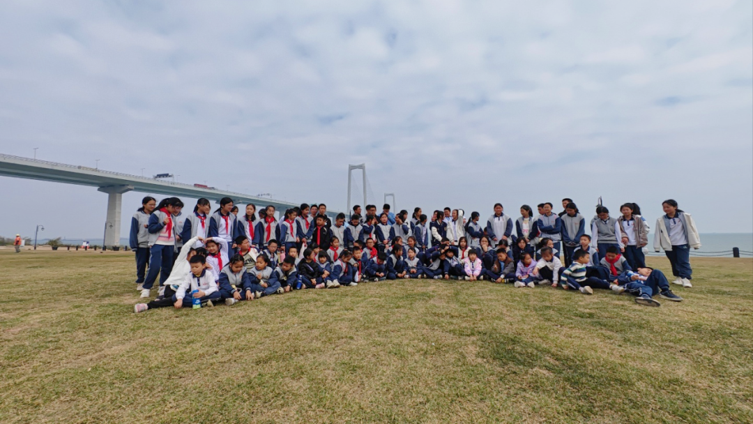 这是孩子们的深中通道研学之旅:一群身穿校服的学生正在深中通道旁的草坪上开心合影。画面中,蜿蜒壮观的跨海大桥与孩子们灿烂的笑脸相映成趣,相机定格着这场奇妙相遇。