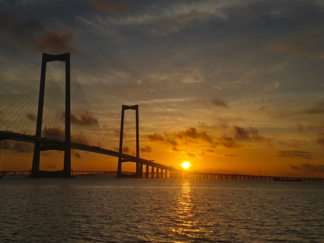 一直期待着来深中通道看一场日出,今天终于如愿以偿。当我站在桥畔时,眼前的一切美得让人屏息。天边渐染青灰,倏尔光刃刺破暗穹,橙金赤彩奔涌而出,将夜幕撕裂。波光顿化碎金,似有人揉碎万顷碎银洒入波涛,粼粼跃动直至视野尽头。