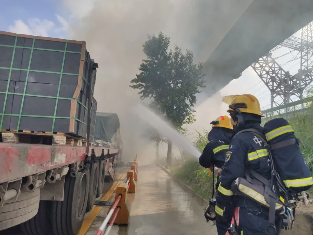 10月11日上午,东凤镇东阜二路北一辆满载货物的半挂货车突然起火,由于消防部门接警后迅速到场,加上火灾发生后车上人员迅速撤离,火灾未造成人员伤亡。