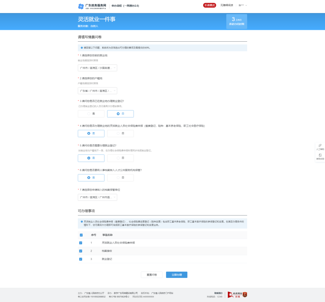 2.智能导办:回答户籍与就业状态问题,系统将自动筛选出可办理事项清单及需提交的材料清单。