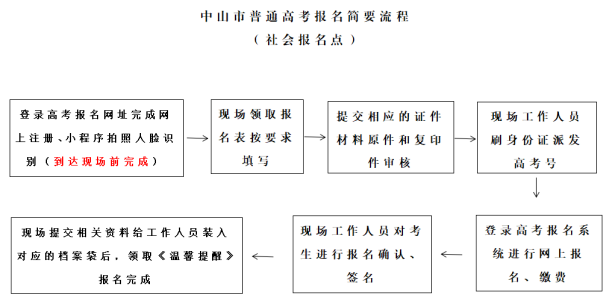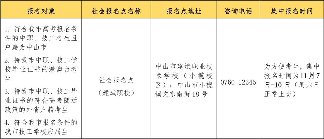 (一)应届毕业生原则上在学籍所在的高中阶段学校报考,学籍所在学校不设报名点的,在我市指定的社会报名点报考。中山户籍的往届毕业生、同等学力人员原则上在我市指定的社会报名点报考;我市高中阶段学校毕业的符合我市报名条件的随迁子女往届生,在我市指定的社会报名点报考。广东省户籍但非中山市户籍的往届毕业生不得在我市报考。
