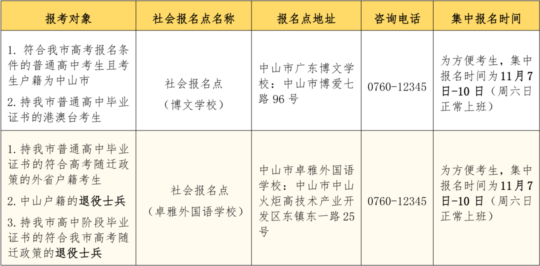 (二)我市实施社会生分类报名,请认真对照报考对象限制,前往对应的社会报名点: