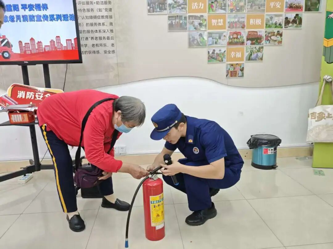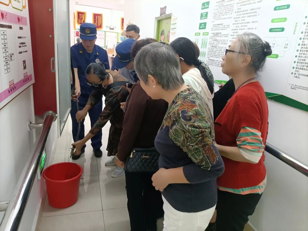 消防宣传员向长者们讲解了居民家庭火灾的预防、初期火灾的扑救、安全用火用电、报火灾方法等内容,并手把手指导长者们使用灭火器、防烟面罩、室内消防栓等消防设施,让长者们在寓教于乐的同时学到了丰富的消防安全知识。