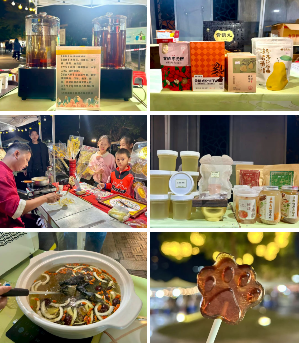 药食同源区香气四溢,成为“逛吃党”的养生乐园。针对冬季感冒多发,夜市贴心准备了祛湿防流感茶,免费赠饮暖心又实用;爆浆黄精梨膏软糖、黄精枣泥糕等健康小食,让孩子在解馋的同时润燥养生;现场制作的麦芽糖糖画,不仅勾起许多人的童年记忆,更成为夜市的“人气伴手礼”。此外,椰子煲鸡汤、海底椰雪梨膏等二十余款养生美食,也让市民在美味中吃出健康。