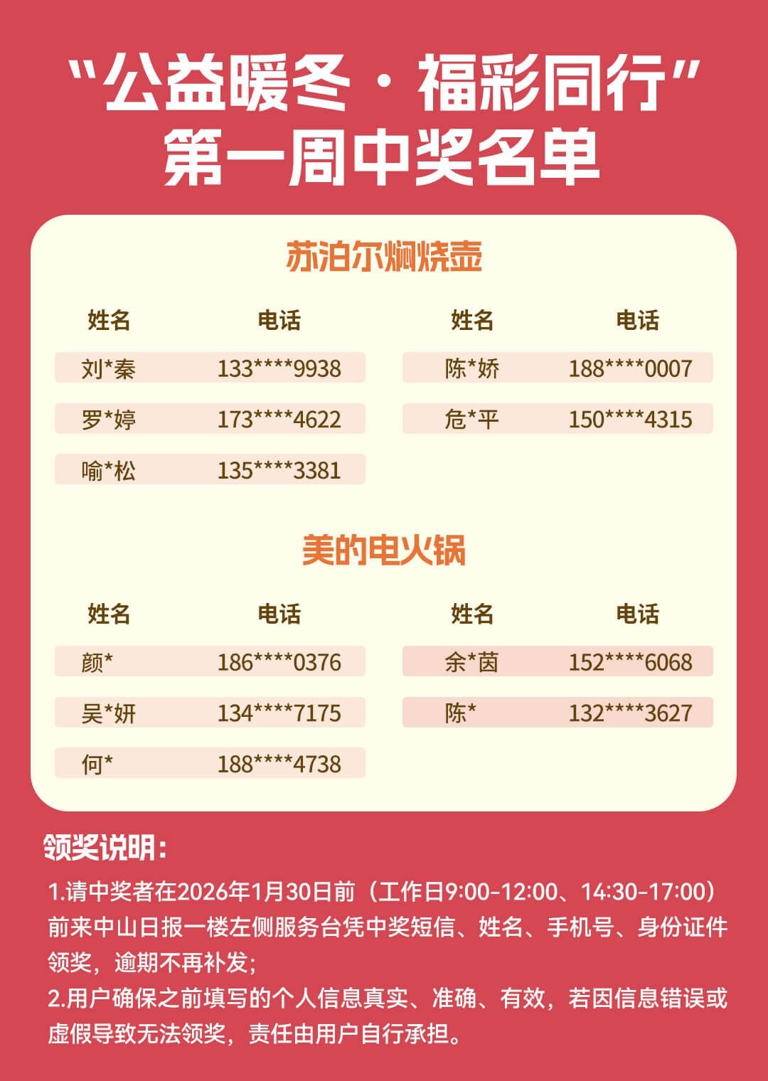 3.中奖结果将在本条推文内公布,并以短信方式通知中奖用户。请中奖者在2026年1月30日前(工作日9:00-12:00、14:30-17:00)前来中山日报一楼服务台凭中奖短信、姓名、手机号、身份证件领奖,逾期不再补发。
