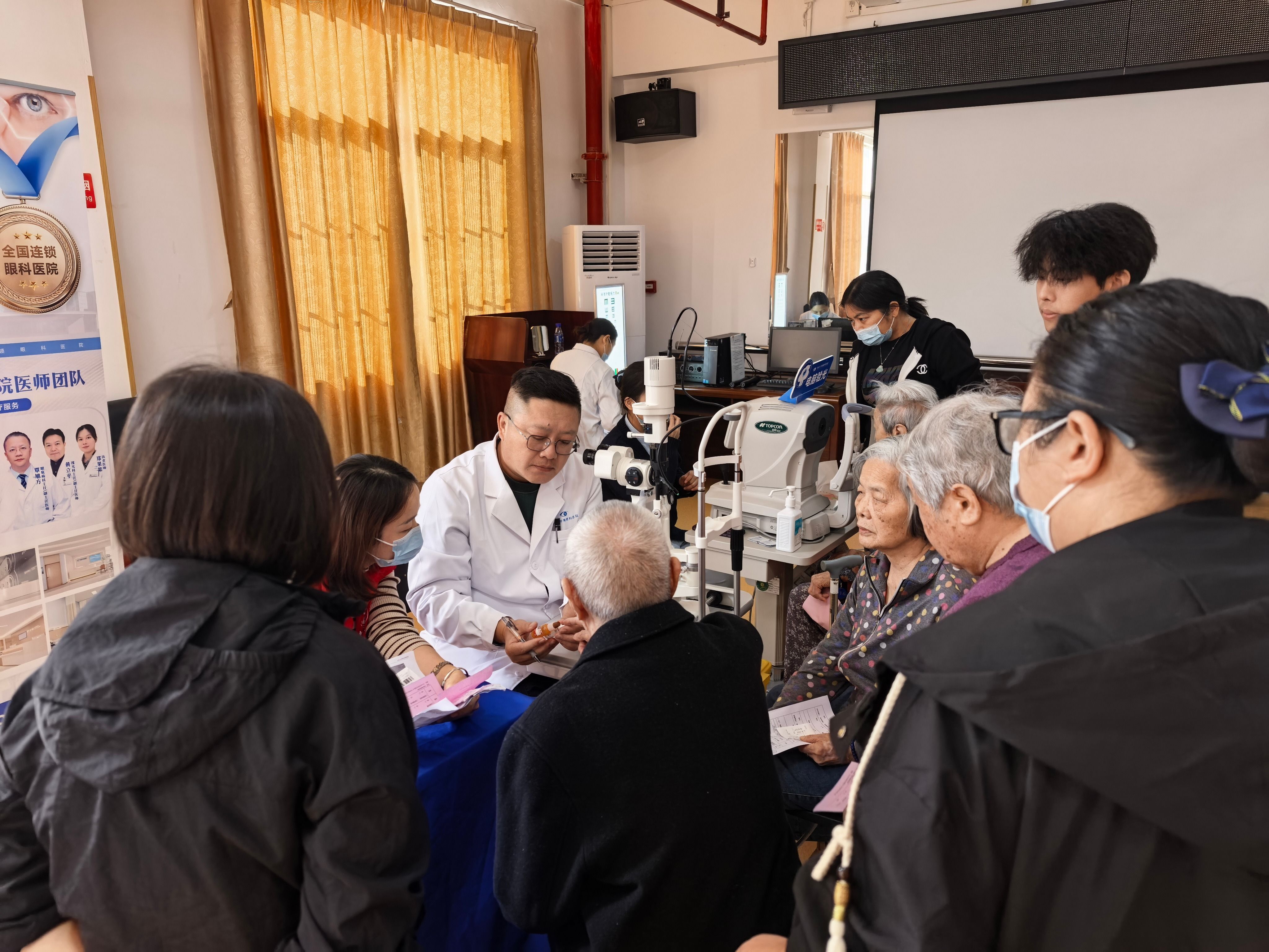为切实满足老年群体的眼健康需求,活动当天,中山华厦眼科医院精心组建了一支由眼科医生、验光师、护士等组成的精锐医疗团队。他们携带裂隙灯、眼底相机、视力检测设备等专业仪器,为长者们提供涵盖视力测试、眼底检查、干眼熏蒸体验等在内的全方位眼健康服务。