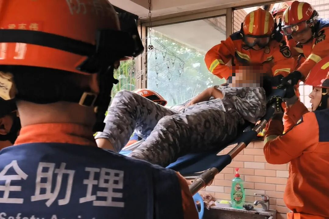 经过现场勘查后,消防员决定利用担架将男孩转运到地面。在现场医护人员的指引下,消防员慢慢将男孩转移到担架上并调整好姿势,以防转运过程中触碰到受伤部位。随后,消防员相互接力,缓慢地将男孩抬到阳台,再转运到医护车上,送往医院作进一步治疗。