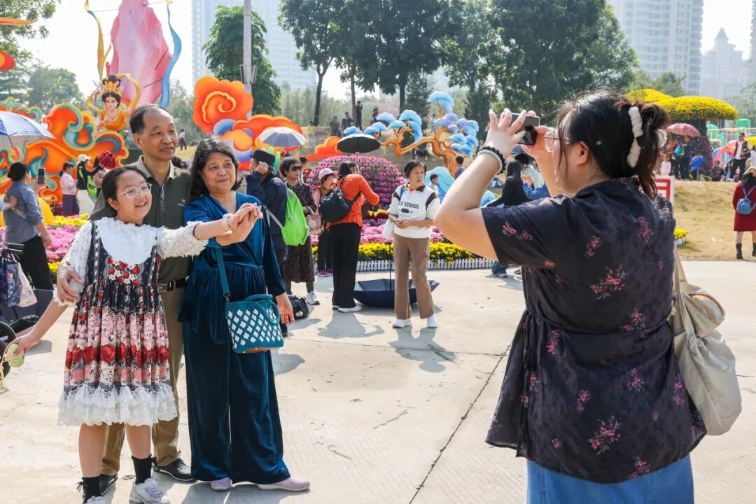 周末两天,菊花园内人头攒动、赏菊人流络绎不绝,亲子结伴、一家出游的身影随处可见。广州游客王先生一家三口专程驱车而至,刚入园便被临湖矗立的7米高“菊花女神”造景吸引,频频为妻儿拍照留念。“早就听闻小榄菊花会名不虚传,特意赶在最佳观赏期前来,没想到菊花绽放得如此繁盛,还有打破纪录的嫁接大立菊,实在太震撼了。”王先生笑着说。赏菊过后,一家人计划前往美食区,品尝小榄地道风味。“早就听说脆肉鲩、炸鱼球等小榄美食,今天特意带家人来好好尝尝。”