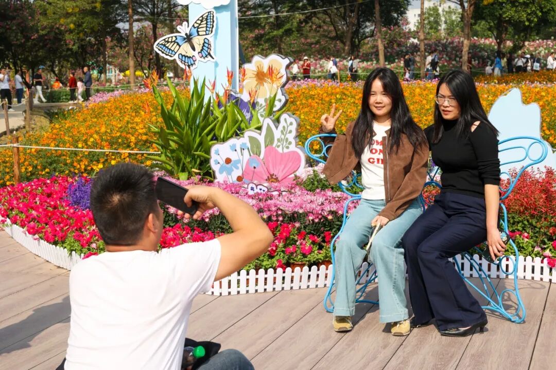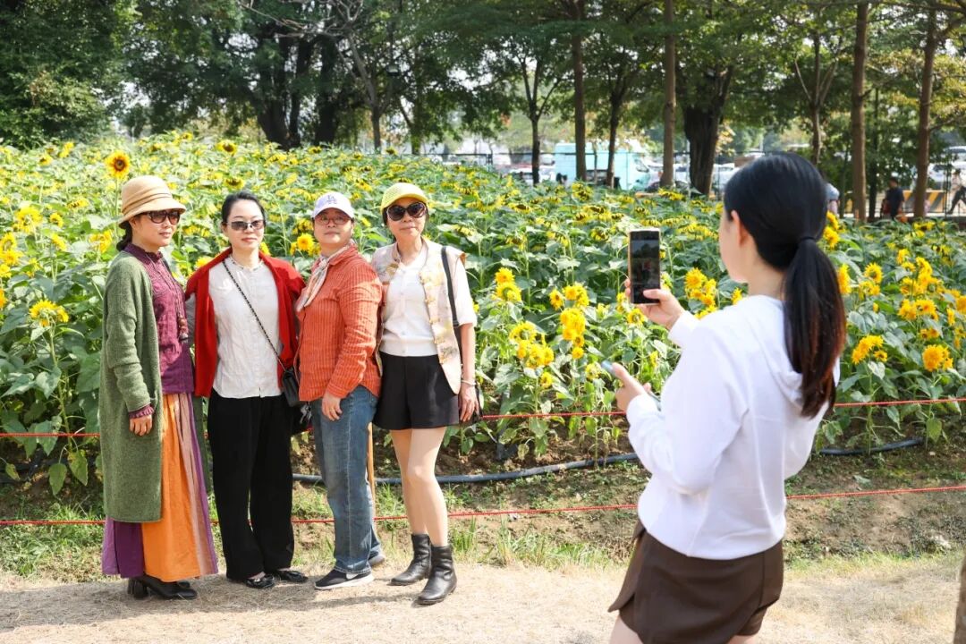 花海区的金色大地音乐现场,花香与旋律交融,吸引不少游客驻足欣赏。几位女游客跟着音乐轻轻哼唱,沉醉其中。“做攻略时就知道现在是赏菊最佳时段,特意调休过来。既能赏满园繁花,又能听悠扬乐曲,整个人都彻底放松了,这份惬意太难得了。”其中一位游客说。