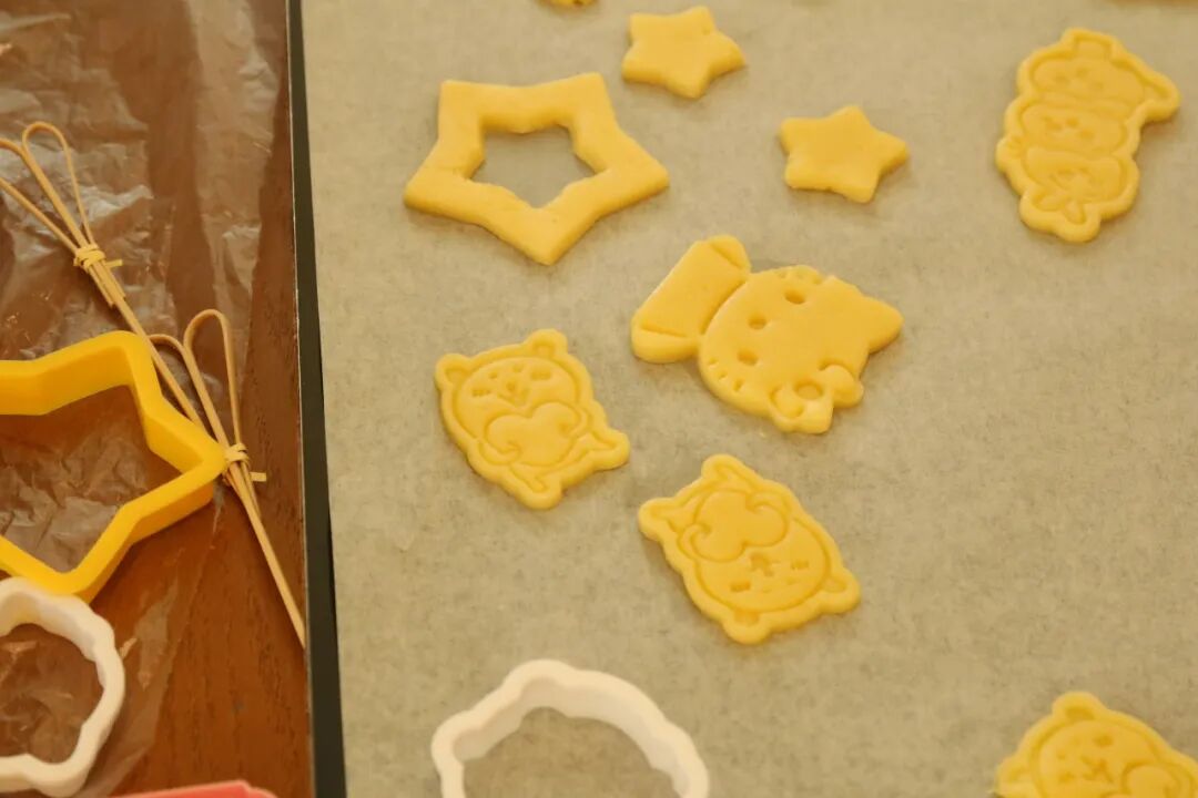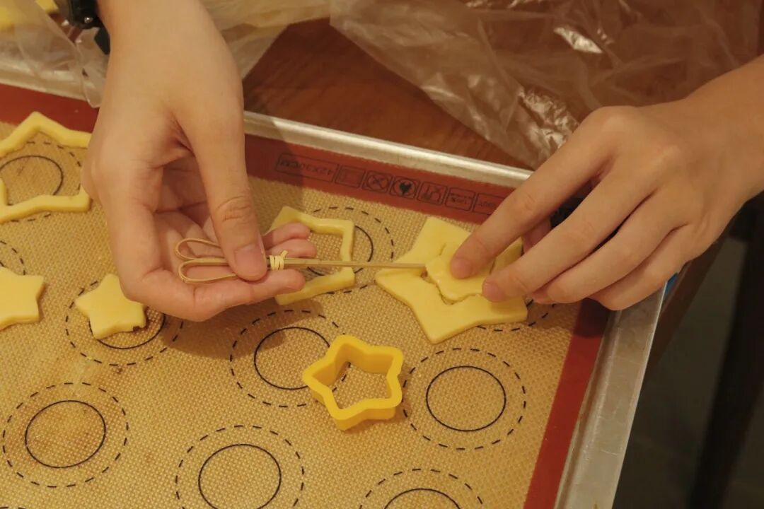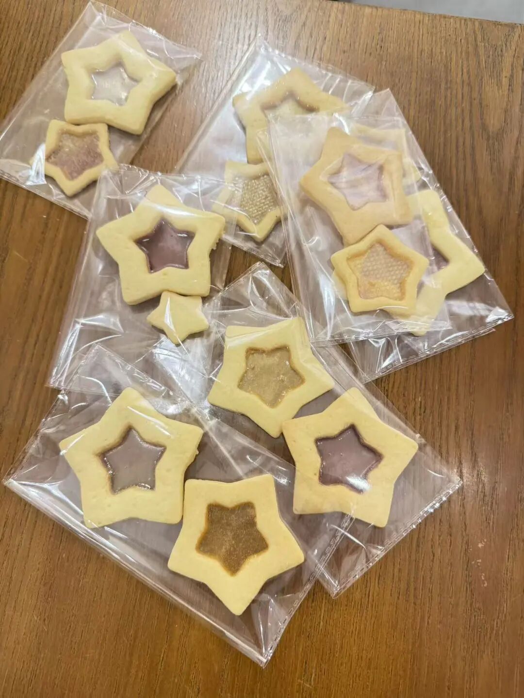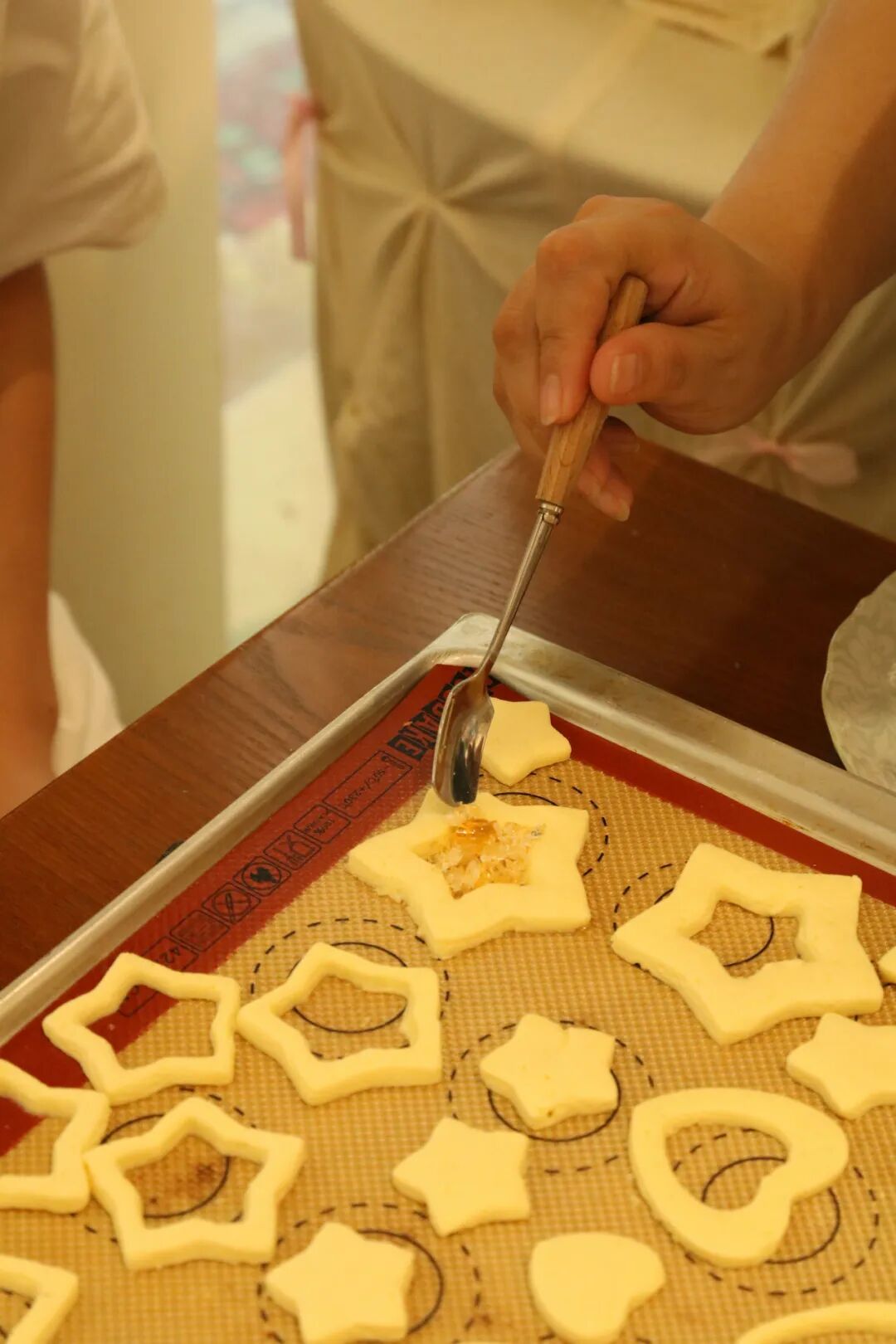 先把面团擀平,再将星星形状的模具按压上去,在星星中间挖个小窗口,放上彩色的糖果碎,烤好出炉。