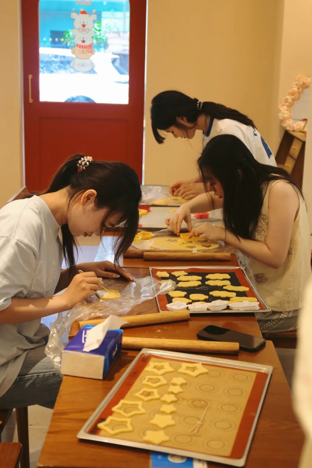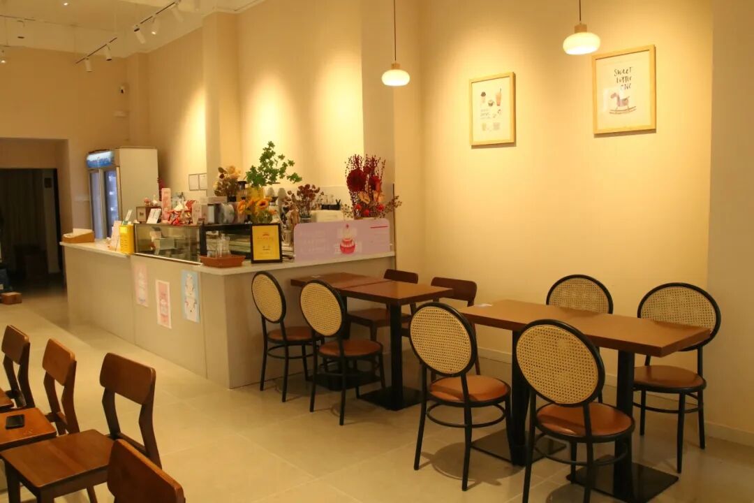 一进店就被暖黄的灯光包围,处处干净整洁,空气中还飘着黄油与面粉混合的香气,甜滋滋的。两边供顾客堂食的小桌可以拼成长桌,为DIY的顾客提供宽敞的创作空间。