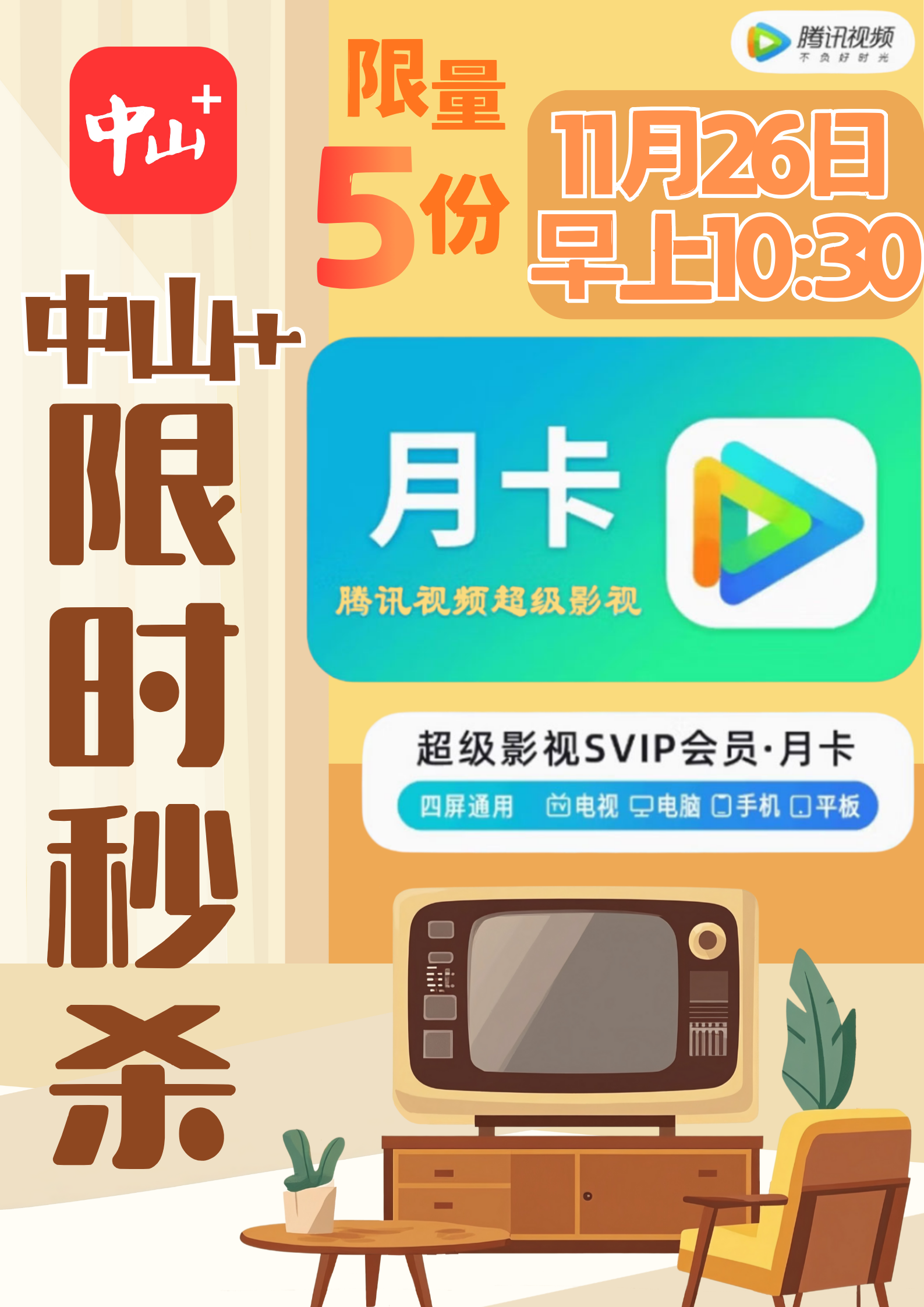 【秒杀】本周三200积分秒杀腾讯视频会员,中山+又来送福利啦!