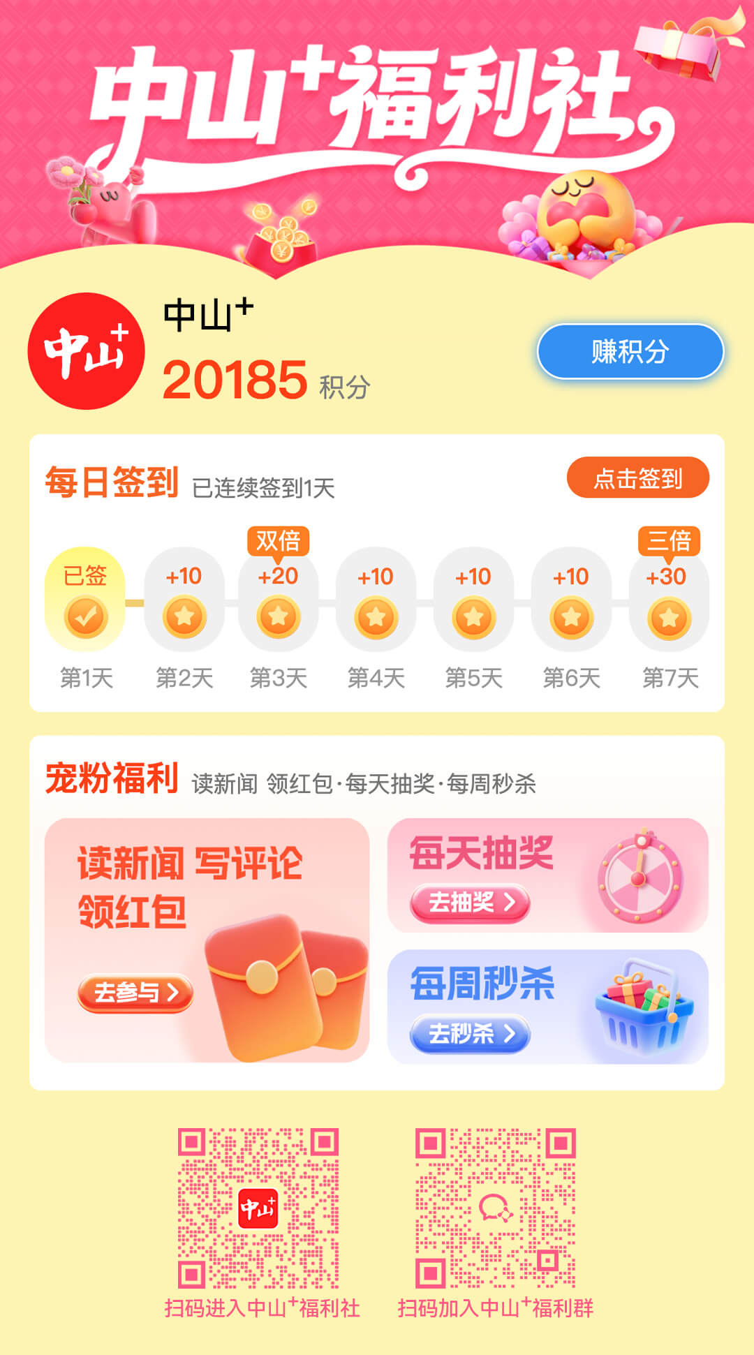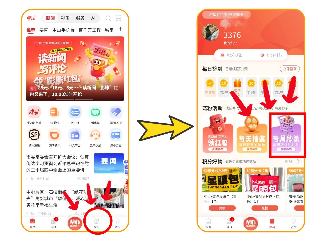 下载完成后,记得打开“中山+”点击右下角“福利”按钮,并按照提示使用微信一键登录。在“宠粉活动”的“每周秒杀”参与即可。