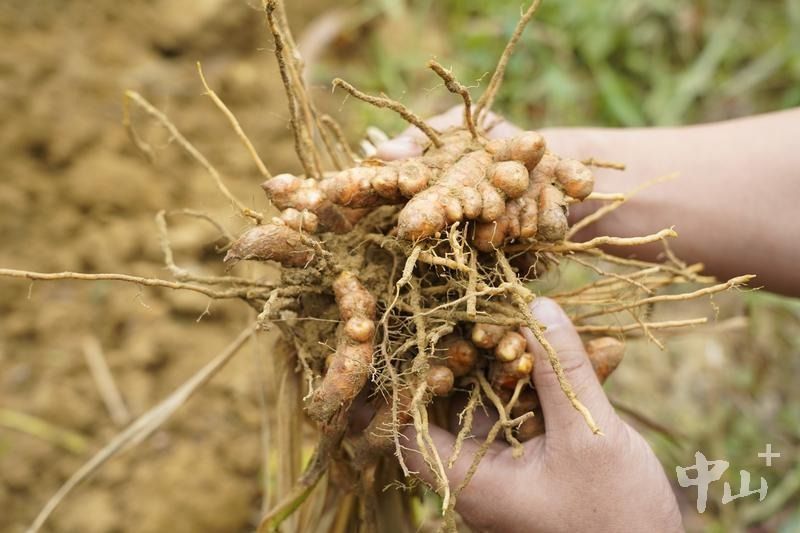 五桂山旗溪村沙爷河边,野姜花香悠悠飘散,正是姜黄成熟季。村民孙伯伯领着记者来到种植一年期的姜黄田,挥动锄头,深褐色土壤中翻出的姜黄根茎饱满。“这些姜黄‘喝着山泉水长大’!”他笑着掰开一节根茎,橙黄色断面在雨幕中泛着光泽。“我们采用生态种植法,每亩产量约2000斤。”