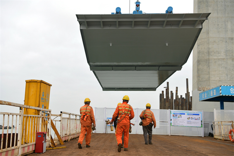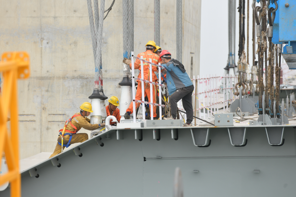 钢箱梁被平稳拉升到设计标高,施工人员将吊索与梁段永久吊点通过销接进行连接。(摄影:缪晓剑)
