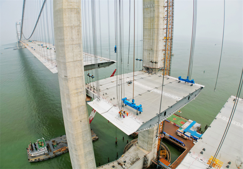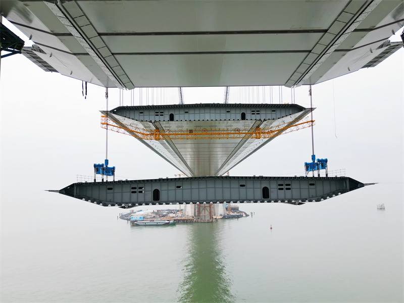 深中通道伶仃洋大桥主塔高270米,共有213个钢箱梁节段。(摄影:缪晓剑)