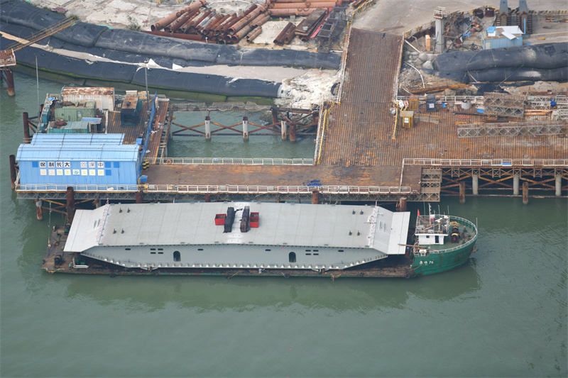运梁船将一片钢箱梁运抵伶仃洋大桥西锚碇水域。(摄影:缪晓剑)