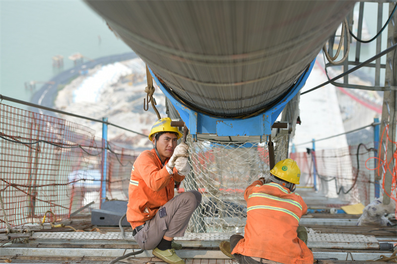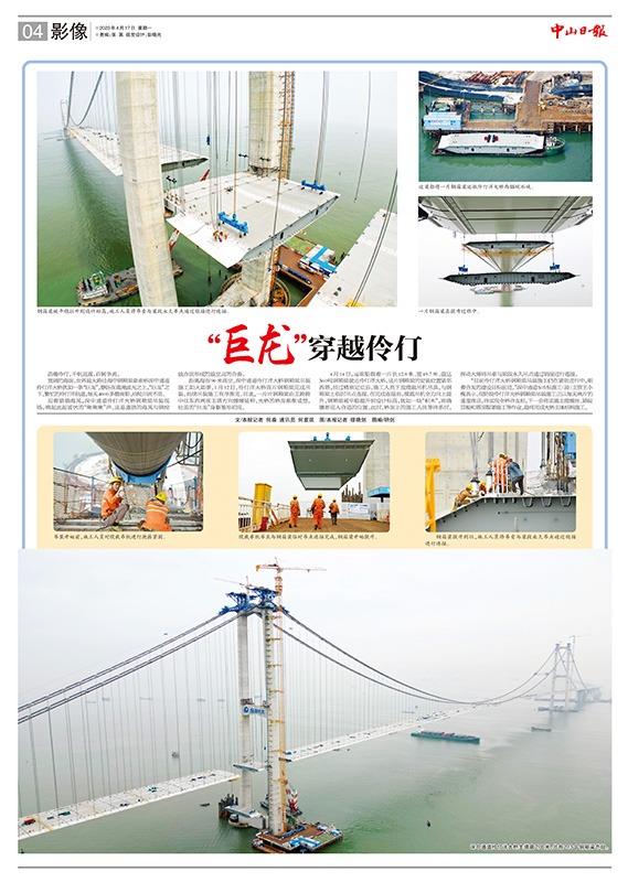 迎着猎猎海风,深中通道伶仃洋大桥钢箱梁吊装现场,响起此起彼伏的“啾啾啾”声。这是遒劲的海风与钢绞线合弦形成的最空灵的合奏。