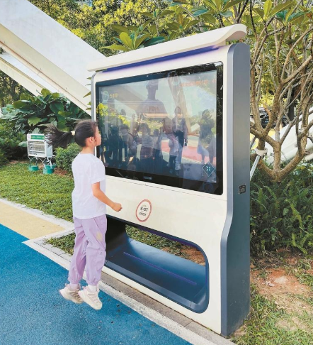 靠近体育公园南门的AR互动大屏前,8岁的紫萱带着弟弟妹妹跳起来挥舞双臂,随着肢体动作屏幕上的西瓜被“切开”,音视频效果让他们欢呼雀跃。“同样的切西瓜游戏比手机上玩好多了,又能锻炼身体又有助于摆脱手机依赖。”他们的妈妈拉着露营车,笑眯眯地看着孩子们玩。