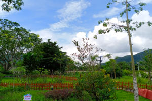 顺着山势蜿蜒盘旋的环山绿道,入眼皆是绿意,左边是青山,山上有很多的古树,葱郁苍翠,山边上随意的盛开着紫色的野牡丹,还有黄的,白的野菊花,明媚艳丽,在绿草绿叶丛中特别耀眼。依山开垦的茶田里,茶农们正忙着采茶,文友们纷纷拍照,留下这诠释勤劳的美好时光。绿道右边是绿草掩映着的沟涧,一路上泉水叮咚,鸟儿欢鸣,让我们也忍不住想哼上几句山歌,来和这大自然的乐曲。此情此景,竟有文友像小孩子一样,一路小跑,一边跑,一边随意的吼叫,在这里,我们回到了童年,心胸纯稚,无忧无虑,自由自在。