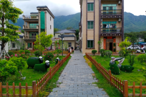 村里土地平旷,房屋的布局井然有序,都是两层的民居。村前是一个掩映在绿荫下的大水池。池水也是绿幽幽的,池边是精心打造的小公园,绿色的草坪,娇艳的红月季,淡雅的黄菊,还有那两只用绿草编制的孔雀,栩栩如生,尾巴长长的,尾部点缀着各种颜色的小花,绚丽多彩。这里的一草一木,一石一景,无一不让人感受到设计者的匠心独运。无一不给人美的享受。