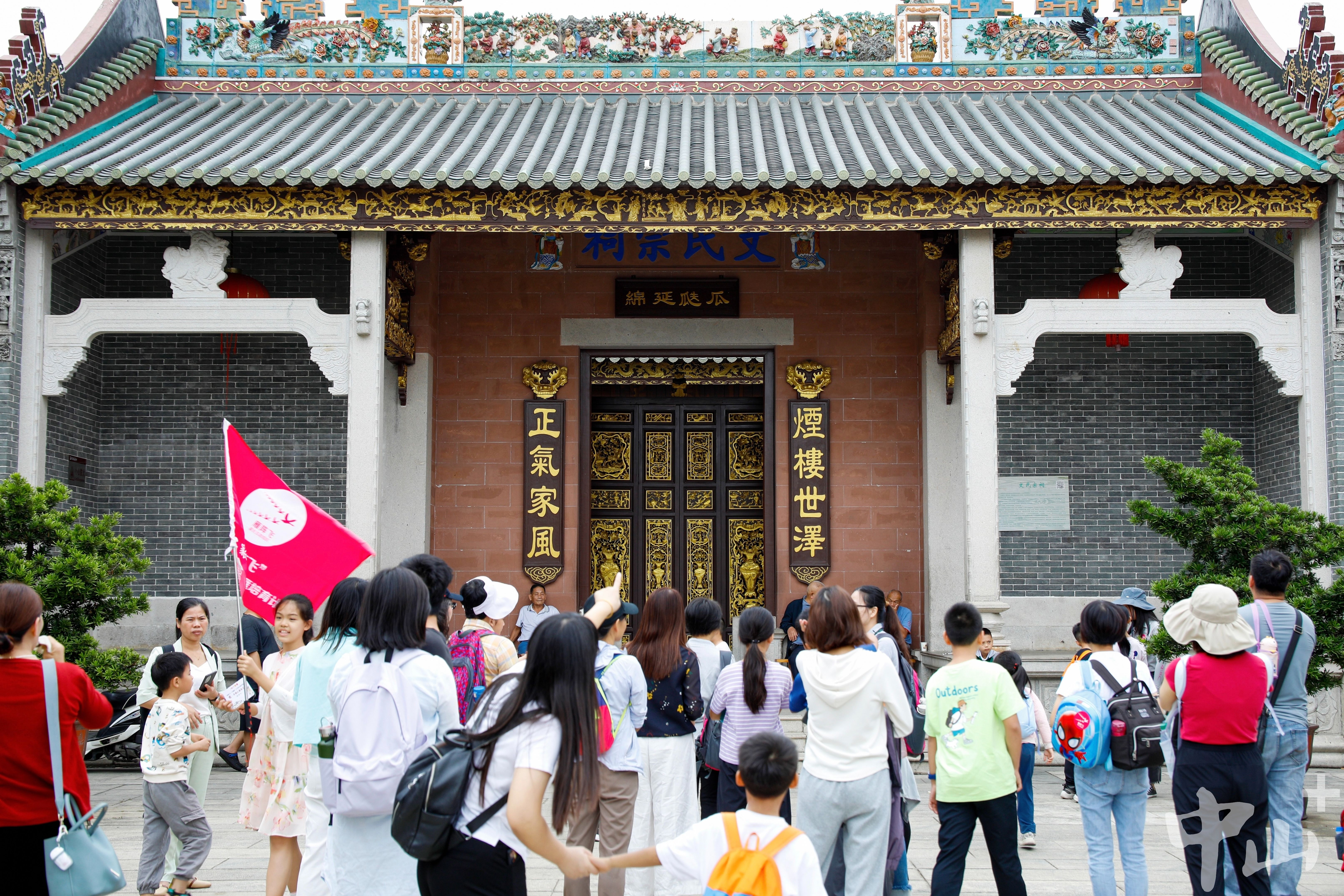 随后,大家脚步不停,走过历史悠久的状元桥,穿过古色古香的街巷,来到位于凤凰古村的文氏宗祠。在这里,亲子家庭探寻文氏后人家风传承的故事,领略古代建筑的精湛技艺。“我刚刚在村里找到了一口古井。”“找到了两口!”孩子们在古村的街巷中欢快地穿梭,寻找着研学卡上的线索,享受着与伙伴们合作和亲子陪伴的温馨时光。