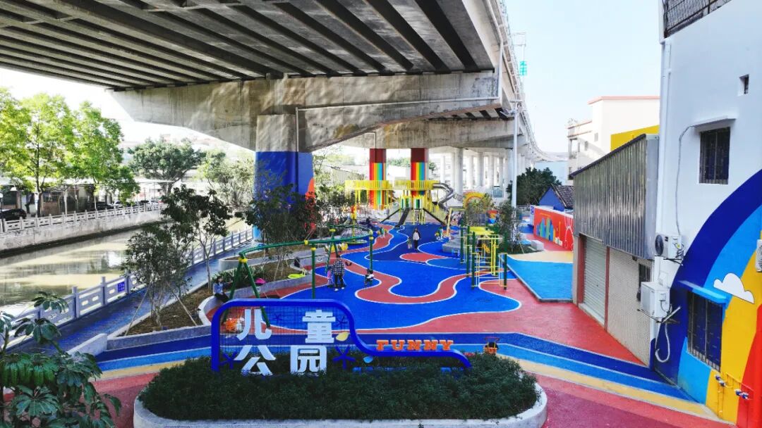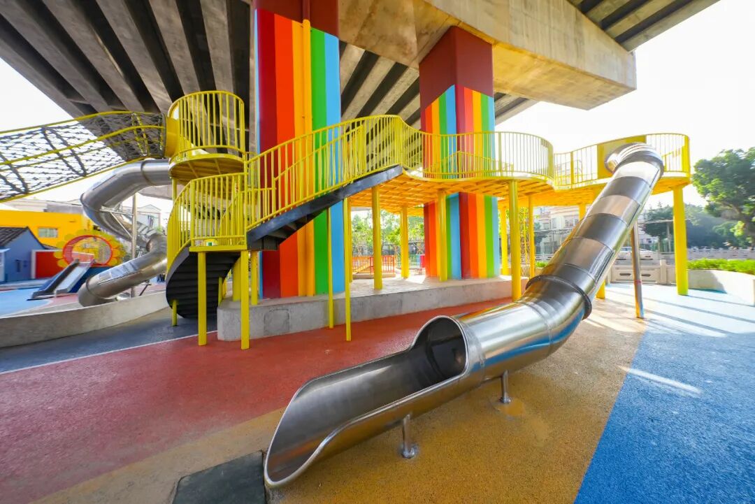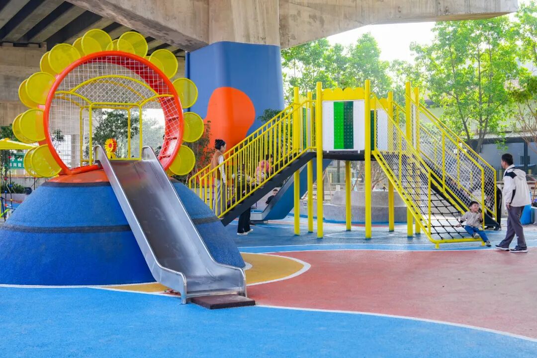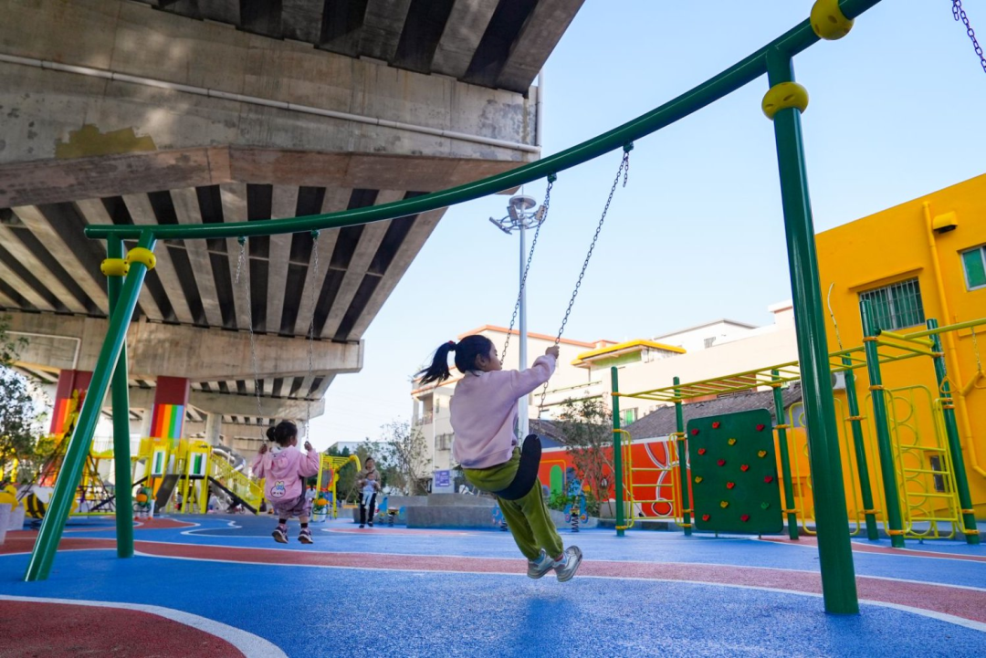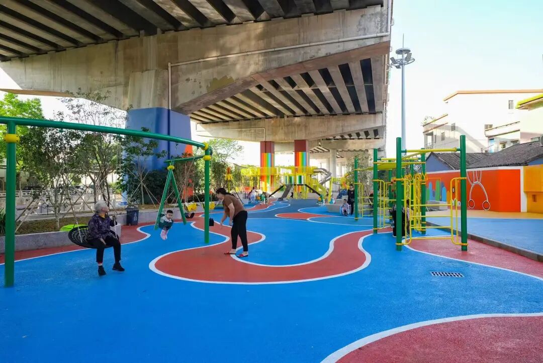 位于中山西环高速桥下的小榄埒西一社区儿童公园,秉承“专业赋能、生态友好、儿童为本”的理念,通过对原有荒地进行硬化铺装、增植绿化和配备专业游乐设施,成功变身为一处色彩明快、充满童真的主题乐园。公园科学划分了不同年龄段的儿童活动区:迷你滑梯、趣味摇马、创意沙坑呵护幼儿的探索欲望;攀爬网、旋转盘则为年龄稍大的孩子提供了挑战的乐趣。就连桥下的结构柱也经过艺术美化,从“碍眼障碍”转变为“视觉亮点”。周边贴心布置的休闲座椅,让家长在照看孩子之余,也能放松休憩、交流互动,无形中促进了邻里关系的融洽。
