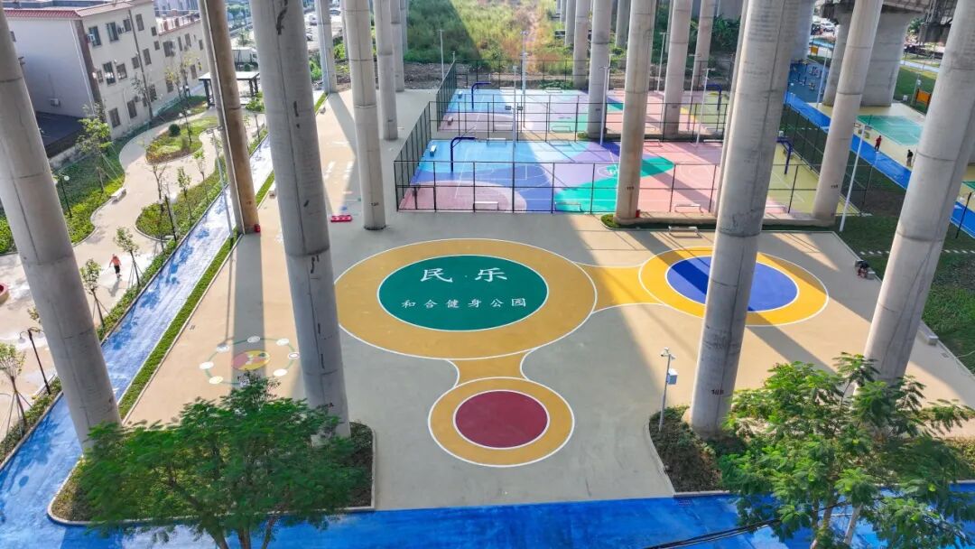 位于广中江高速桥下的东凤民乐社区和合健身公园,则着力打造“全龄友好”的综合性场所。公园内,党建长廊、篮球场、羽毛球场、乒乓球桌、健身区、广场舞区及儿童游乐区等12类设施合理分布,形成一个融合运动健身、亲子互动与休闲放松的复合空间。同步推进的“拆围透绿”工程,拆除了沿线12处围挡,将农房景观、商业街区与河边步道有机串联,形成“一步一景”的文旅漫步线路,使桥下公园成为乡村文旅体验的新亮点。
