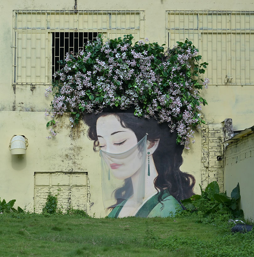 荒芜空地被改造成为一幅“蔷薇女孩”艺术墙绘,成为岐创文化产业园的网红打卡新地标。(摄影|缪晓剑)