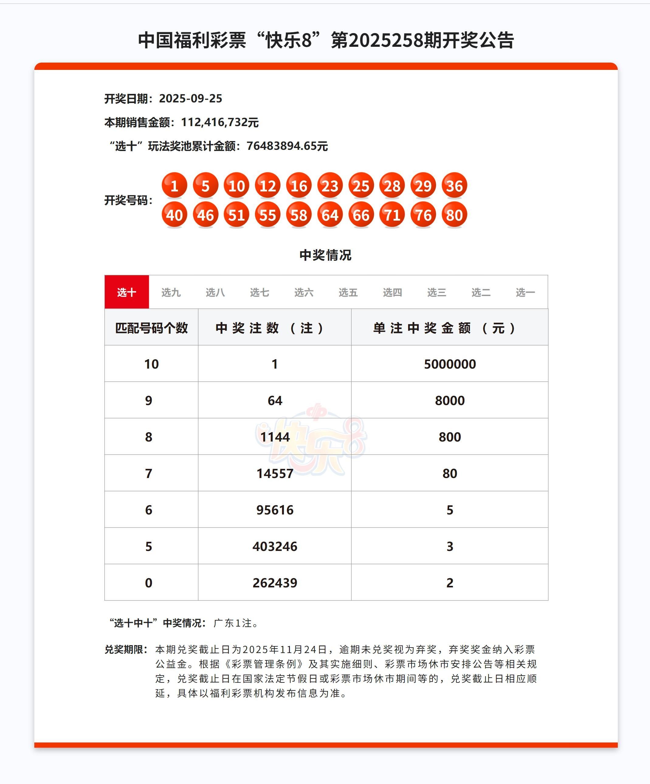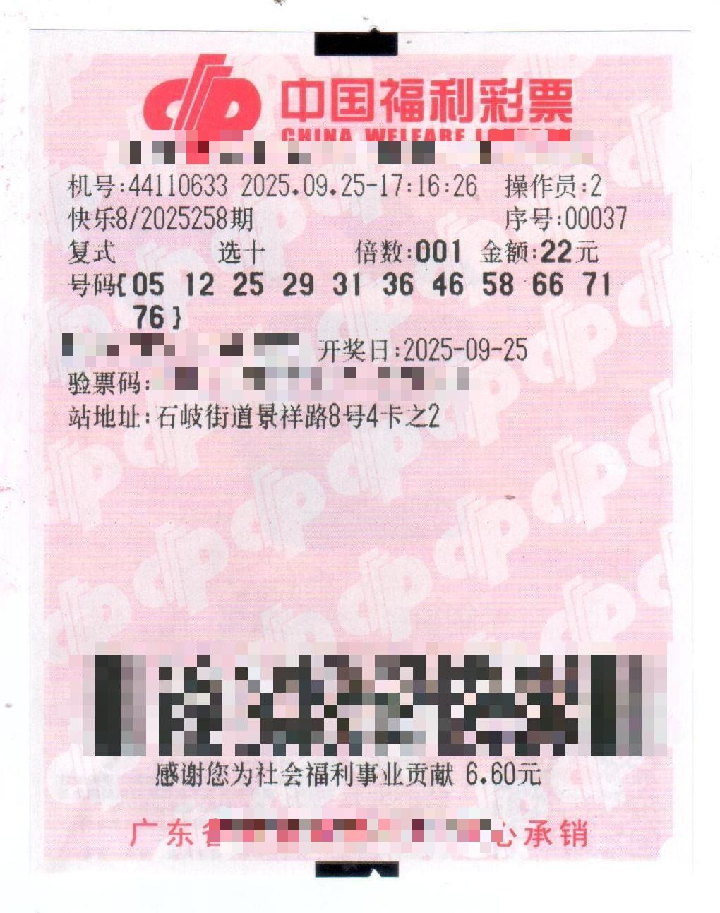 2025年9月25日晚,中国福利彩票“快乐8”第2025258期开奖,当期全国仅中出1注“选十中十”,单注奖金高达500万元。这注幸运大奖花落在广东省中山市石岐街道景祥路8号4卡之2的44110633号福彩销售站点。