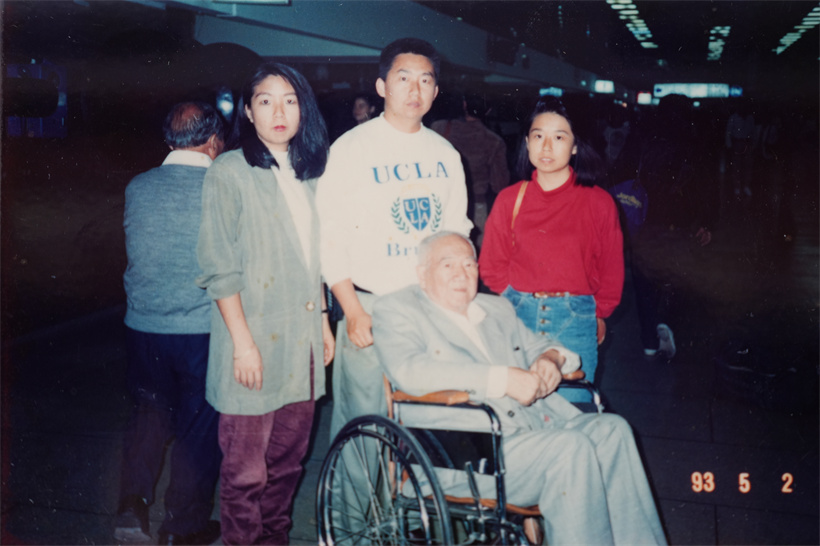 1993 年 5 月 2 日,黄丽斯(左一)推着轮椅送 75 岁的黄三才回中山养老,图为黄丽斯和哥哥妹妹在秘鲁机场合影。