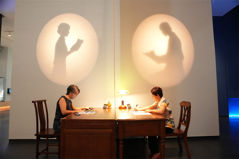 黄三才孙女黄丽斯(左)和表姐黄卡嘉(右)在中山华侨历史博物馆的常设展览里体验书写侨批的互动场景。