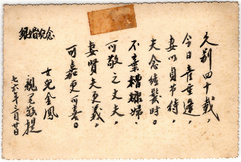 黄三才在家乡一直住到次年春节过后才重返秘鲁。临行前,1976年3月20日,是他和妻子缪淑妤的银婚纪念日。两人也特意前往照相馆拍了一张亲密合影。女儿在他们的照片后题诗一首——“妻以贞节待,夫念续发时”的诗句,正是两人的爱情写照。