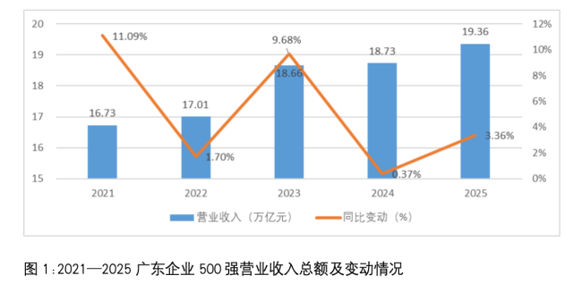 2021至2025年间,广东企业500强营业收入总额从16.73万亿元持续攀升至19.36万亿元,总量创历史新高,2025年增速为3.36%,较2024年的0.37%明显回升,显示出较强的周期韧性。