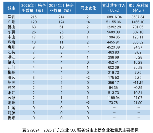 从城市分布看,深圳以216家企业保持绝对领先地位,累计营收突破10万亿元,净利润达8637亿元;广州虽企业数量略有减少(120家),但仍以5.1万亿元营收稳居第二。佛山(63家)、东莞(26家)等珠三角城市表现稳定,形成坚实的第二梯队。