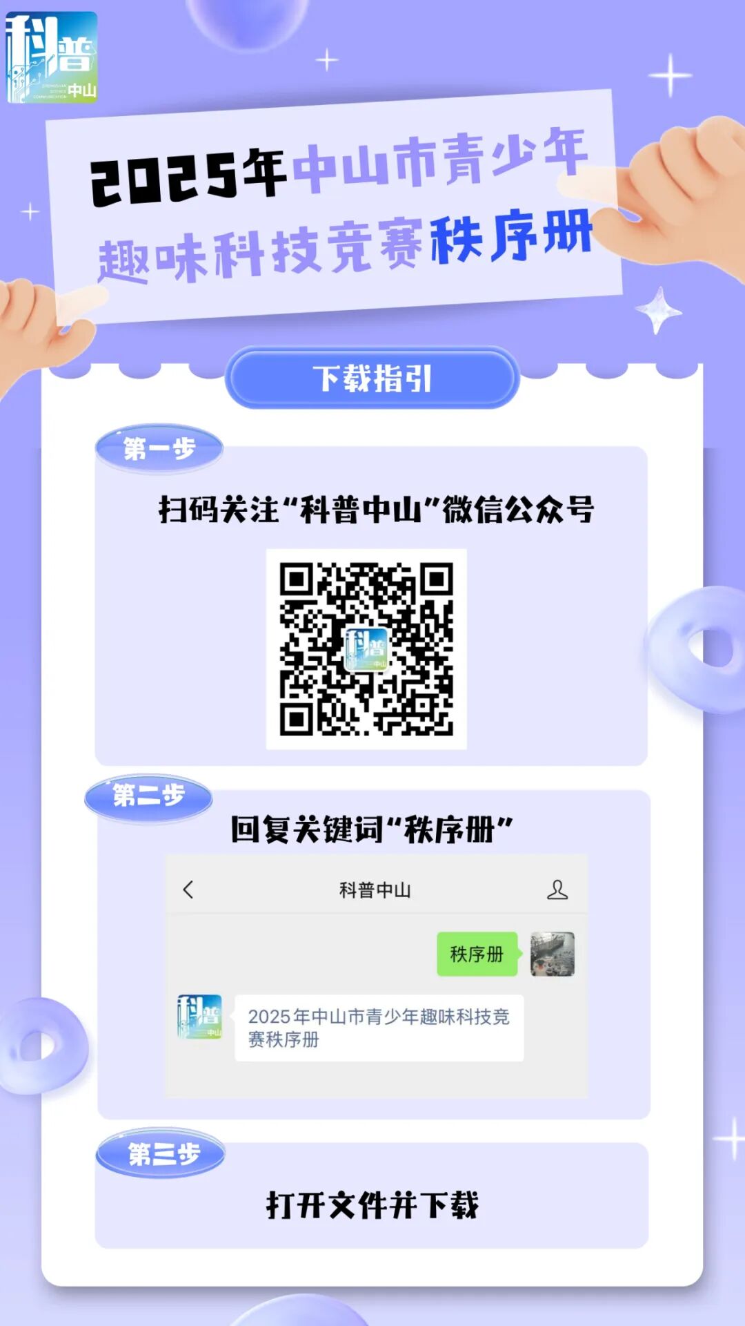 为了方便大家随时随地查阅比赛信息,我们还将在官方微信公众号上提供秩序册的电子版下载链接。只需关注“科普中山”微信公众号,在消息栏回复“秩序册”,即可轻松获取。请大家在比赛前务必下载并仔细阅读秩序册内容,了解比赛的具体安排和要求。具体步骤请见下图。