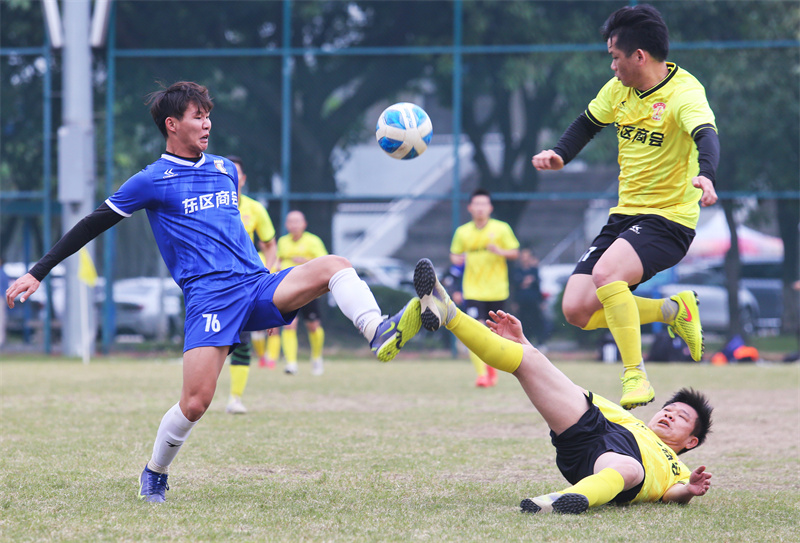 中山市东区街道首届“商企杯”足球赛上,运动员们奋力比赛。(摄影:张变)