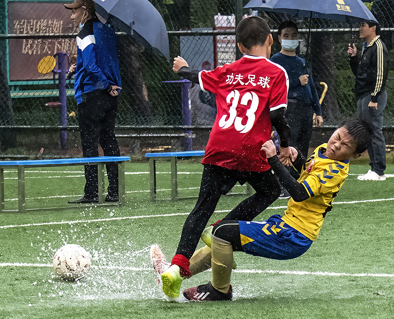 中山市校园足球联赛上,小运动员们在雨中比赛。(摄影:余兴东)