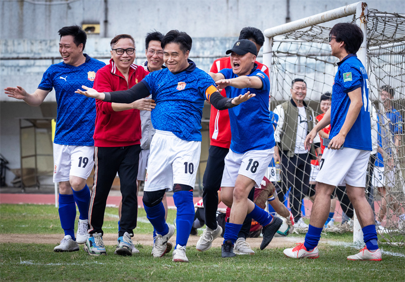 中山市“华鑫杯”足球联赛现场,队员们庆祝进球。(摄影:陈立维)
