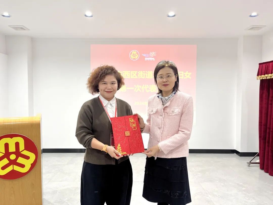 ▲街道人大工委主任范景团为新当选的妇联执委颁发证书