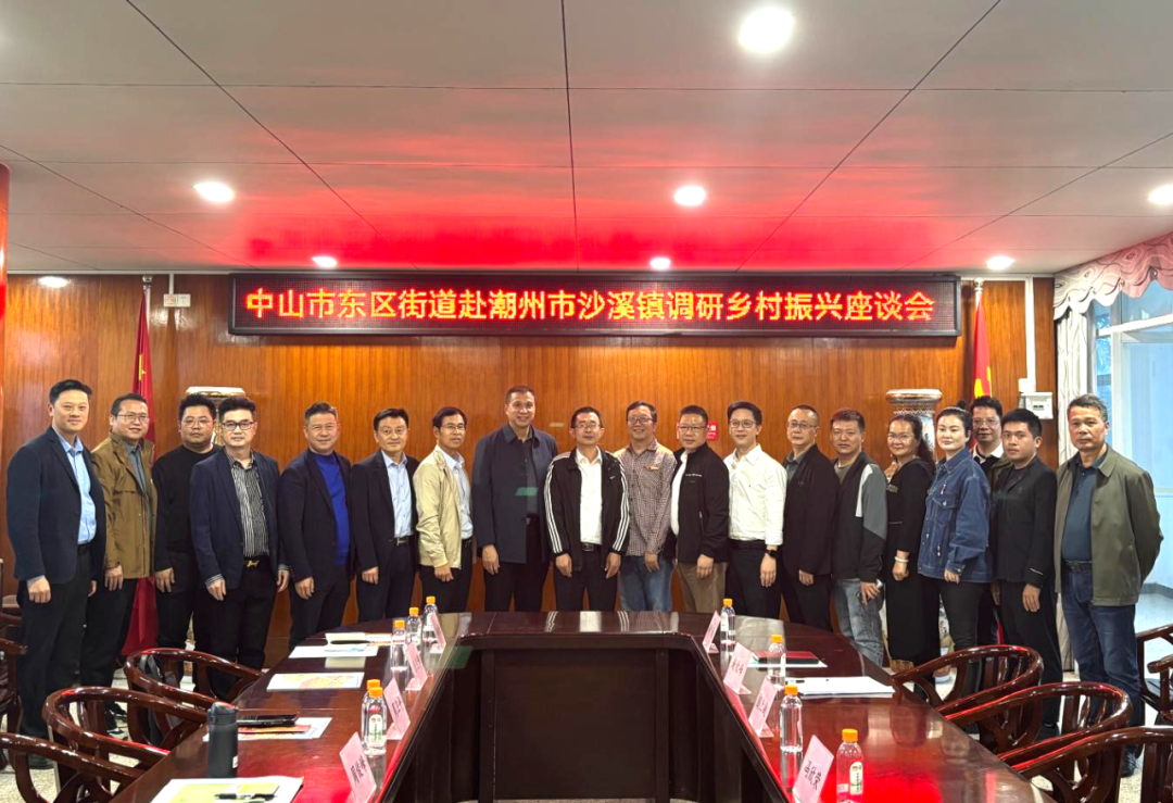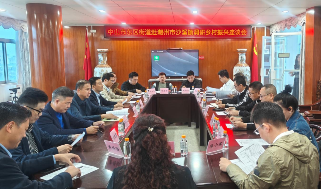 考察组一行与中山市结对帮扶潮州市乡村振兴驻市指挥部、潮安区沙溪镇班子成员进行了调研座谈,详细了解沙溪镇农产品基本情况。会上,驻沙溪镇帮扶工作队队长高志成汇报了今年7月份以来新一轮驻镇帮扶工作开展情况,谢钦峰介绍了沙溪镇的镇情村情民情、经济和产业发展现状,并代表沙溪镇党委、镇政府全力支持驻镇帮扶工作,表示与东区组团同频共振,结合“百千万工程”重点项目,共建沙溪镇“一河一街三片区”。